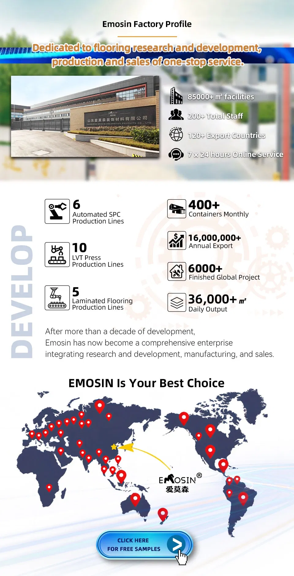 Our advanced factory covers an area of 85,000 square meters, equipped with 6 automated SPC production lines and 18 LVT press lines. Monthly production capacity exceeds 400 containers to meet global demand.